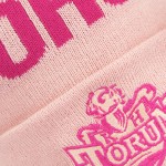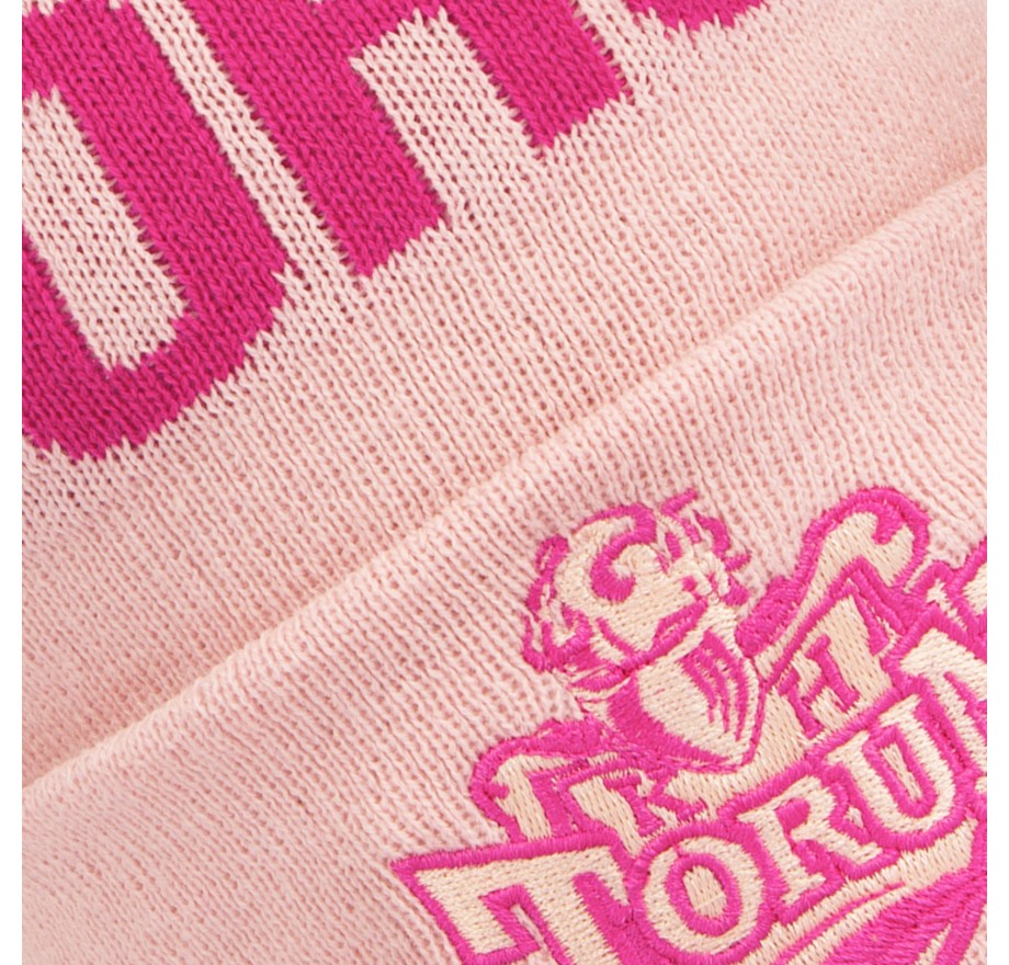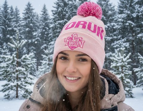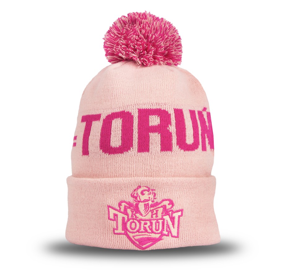 Różowa kolorystyka, kontrastowy napis „TORUŃ” oraz haftowany herb KHT Toruń nadają czapce nowoczesny, wyróżniający się charakter, a całość dopełnia efektowny pompon na szczycie.