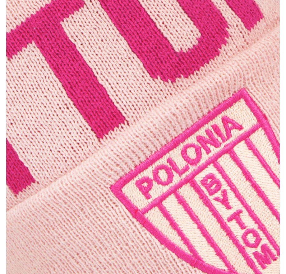 Różowa kolorystyka, kontrastowy napis „BYTOM” oraz haftowany herb Polonia Bytom nadają czapce nowoczesny, wyróżniający się charakter, a całość dopełnia efektowny pompon na szczycie.