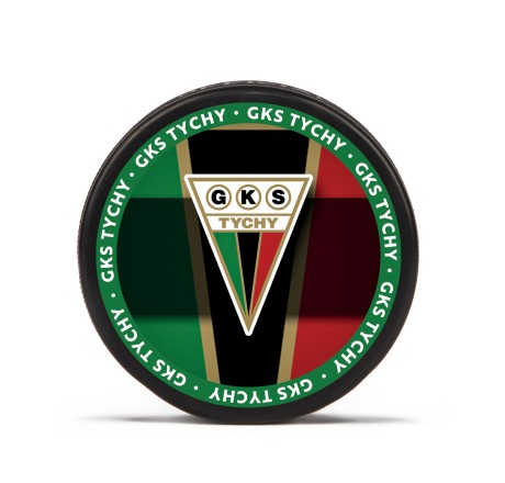 • Krążek ozdobiony emblematem GKS Tychy na tle klubowych barw – zielonego, czarnego i czerwonego.