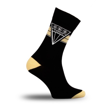 Czarne tło przełamane złotymi akcentami oraz wyraźnym symbolem GKS Tychy nadaje skarpetom nowoczesny i prestiżowy charakter.