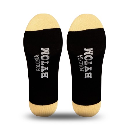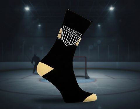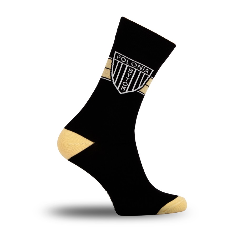 Czarne tło przełamane złotymi akcentami oraz wyraźnym symbolem Polonia Bytom nadaje skarpetom nowoczesny i prestiżowy charakter.