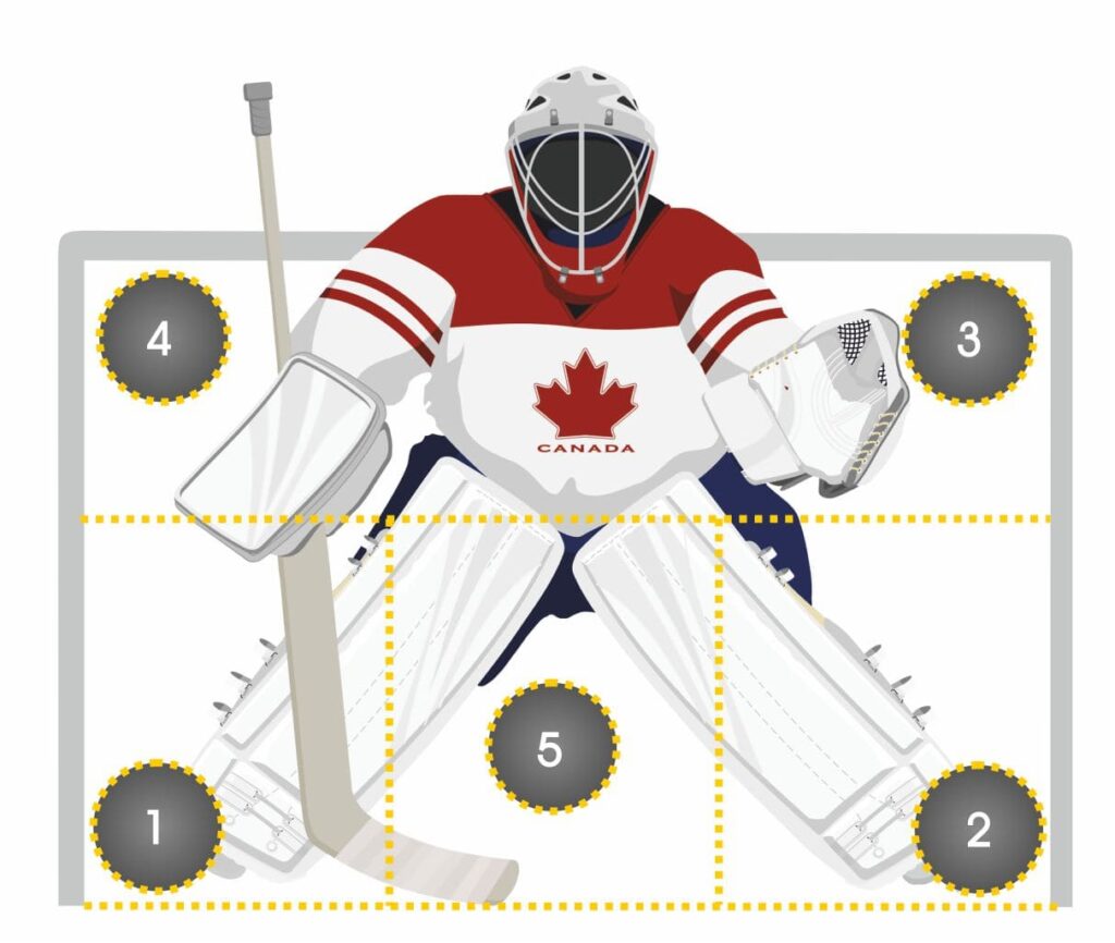 Patrząc na bramkarza hokejowego na tle bramki możemy wyróżnić kilka stref, które dzielą całą “pozycję” na części, dzięki którym łatwiej możemy określić miejsca gdzie krążek hokejowy może potencjalnie znaleźć drogę do bramki. Wersja podstawowa podziału obejmuje 5 stref punktowych. Poniżej krótko je opisaliśmy, a w niedalekiej przeszłości podział ten został rozbudowany o dodatkowe dwie strefy.