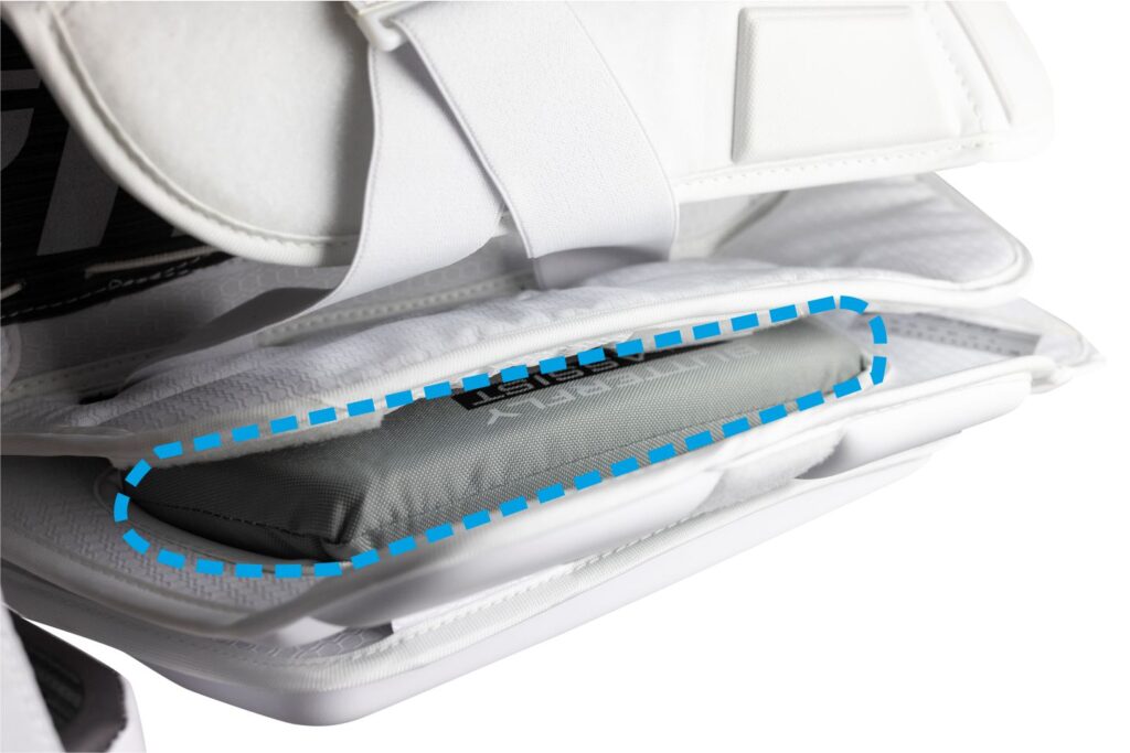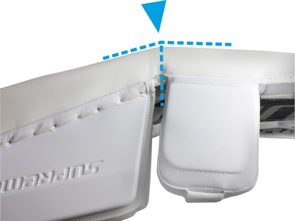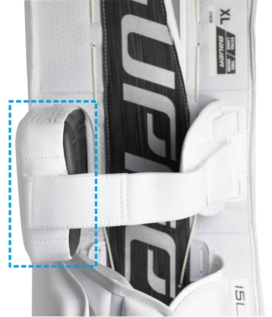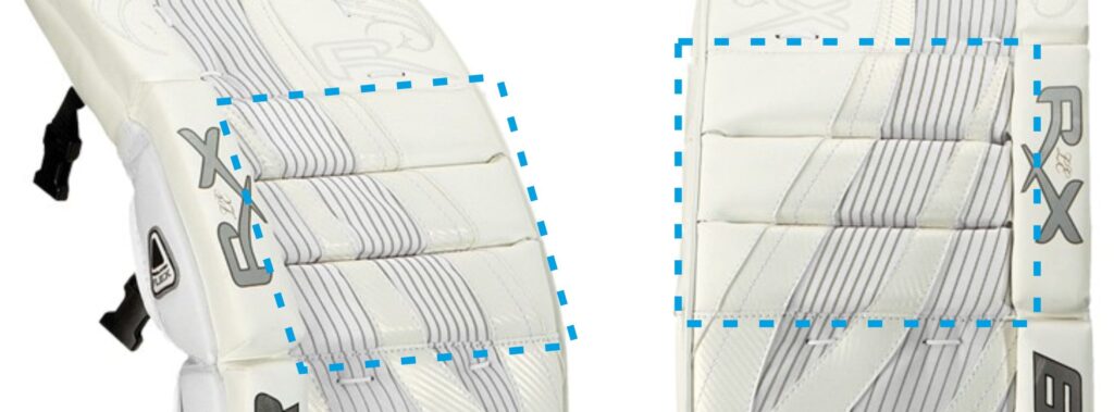 CALF WEDGE lub CALF LIFTS - Klin łydki – panel ( miękka poduszka) umiejscowiona pomiędzy „skrzydłem” a owijaczem łydki. Pomaga lepiej  przyjąć pozycję „butterfly”, podwyższa łydkę względem lodu, zapobiega zbytniemu okręcaniu się parkanów w czasie obrony „butterflajem”.