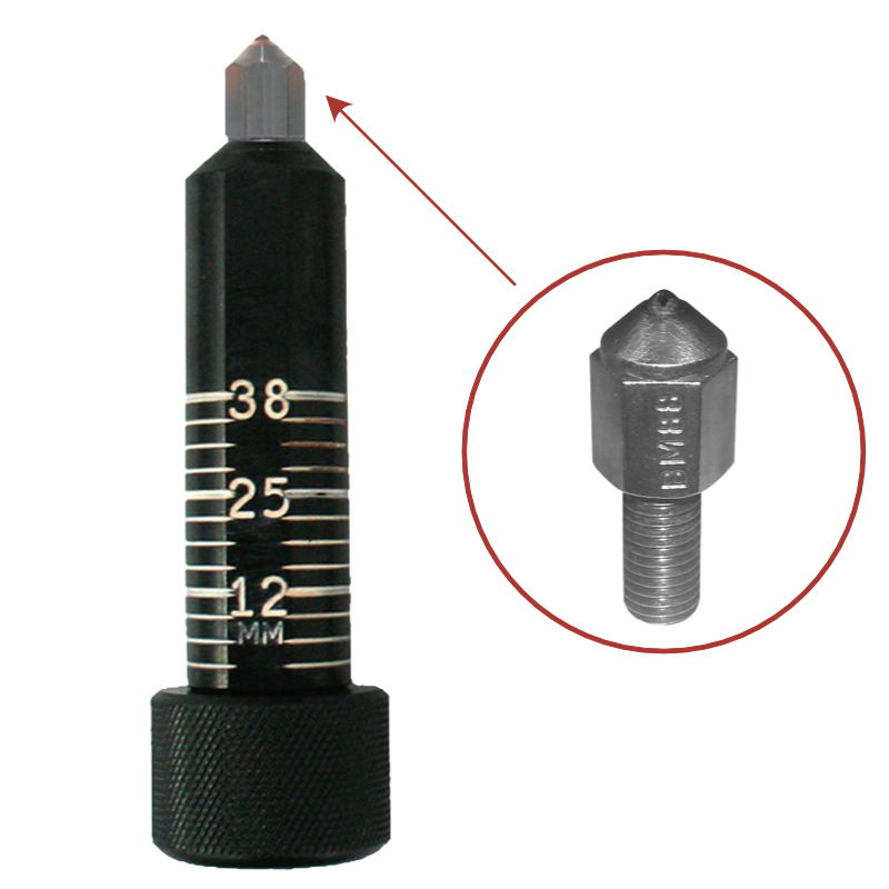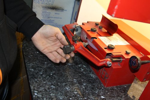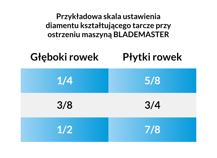 Przed formowaniem krawędzi tarczy musisz ustawić tulejkę w której zamocowany jest diament .Tulejka może być ustawiona w zakresie ¼ – 2 cale (skala ta odzwierciedla głębokość rowka jaki powstanie po szlifowaniu ostrza, im wyższa, tym rowek płytszy. W maszynach Blademaster wartości 1/4 lub 3/8 cala to rowki głębokie, natomiast 5/8, 3/4, 7/8 lub cal, zaliczają się do rowków płytkich. Jeżeli jesteś pewny, że ustawiłeś odpowiednią wartość, zablokuj tulejkę.