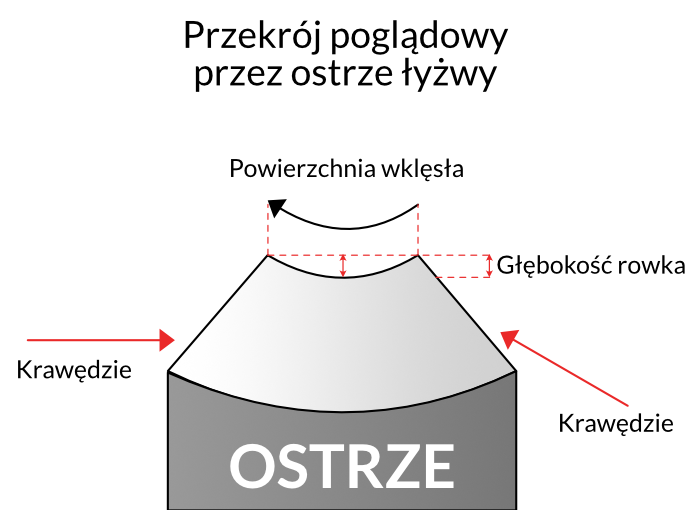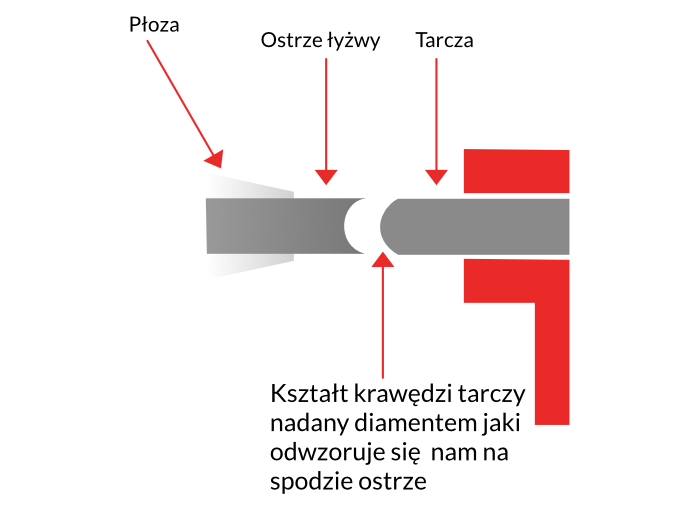 Przy pomocy diamentu najpierw odpowiednio modelujemy tarcze w zależności od głębokości jaką chcemy uzyskać. Ostrząc, kształt krawędzi tarczy szlifierskiej odwzorowuje się na ostrzu łyżwy. Dzięki temu uzyskujemy wklęsłą powierzchnię ograniczoną ostrymi krawędziami na których wykonujemy ślizg. Rysunki powyżej ilustrują ten stan rzeczy. Pusta powierzchnia między krawędziami to rowek jak powstaje przy ostrzeniu, od jego głębokości zależą właściwości jezdne łyżwy.