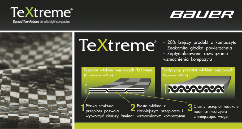 Najbardziej innowacyjne włókno węglowe w hokeju. Odporniejsze na obciążenia o 20% w stosunku do tradycyjnych włókien węglowych, przy obniżeniu wagi o 20%. Na rynku hokejowym firma BAUER posiada wyłączność na użytkowanie technologii TeXtreme.