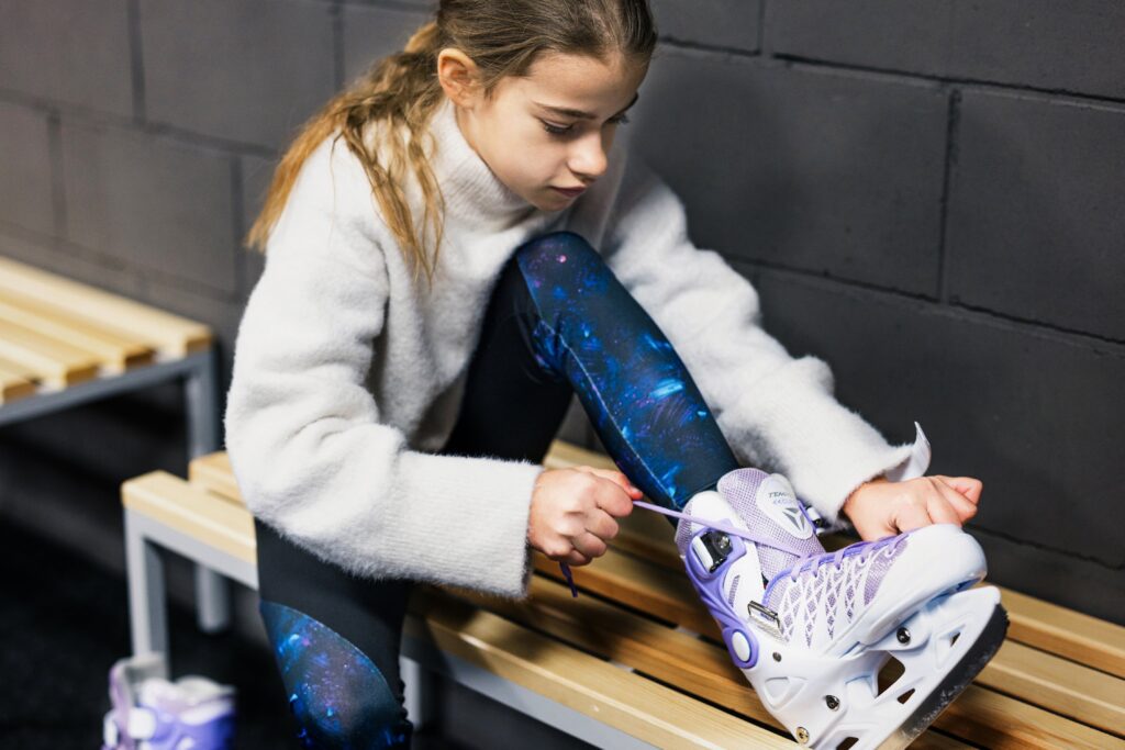 Na rynku istnieje bardzo duży wybór sprzętu łyżwiarskiego. Na początek warto zdecydować się na łyżwy figurowe, w których łatwiej utrzymać równowagę. Łyżwy hokejowe na sam początek mogą okazać się mniej wygodne. Dobór sprzętu to kluczowy element i warto wybrać sprawdzone modele. Nie ma wątpliwości, że gdy dziecku będzie niewygodnie to szybciej zniechęci się do jazdy. Kupując łyżwy zwróćmy uwagę na stabilne podtrzymanie kostki i dobre dopasowanie rozmiaru. Długość wkładki w bucie powinna być o około 0,5 cm dłuższa od długości stopy. Na pierwsze łyżwy możemy również wybrać te z regulowanym rozmiarem. Ich ogromna zaletą jest fakt, że wraz ze wzrostem stopy dziecka nie będziemy musieli wymieniać ich na nowe. Pamiętajmy również o kasku, który ochroni głowę dziecka w razie upadku oraz o rękawiczkach. Zwróćmy również uwagę na ubiór dziecka, który powinien być ciepły ale nie ograniczać zbytnio jego ruchów.