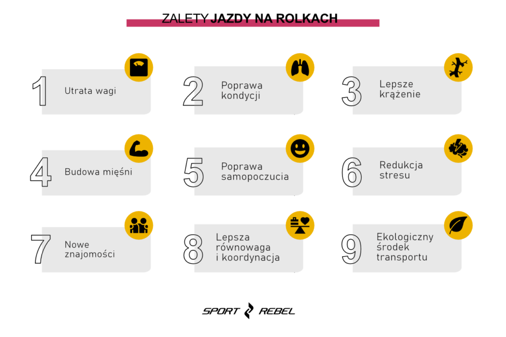 Ponadto, o wiele przyjemniej jest spocić się na świeżym powietrzu, w promieniach słońca i podczas dobrej zabawy. Jazda na rolkach angażuje większość grup mięśniowych, poprawiając przy tym pracę układu oddechowego oraz krążenia. W trakcie jazdy jednocześnie pracują nasze mięśnie brzucha, nóg czy pośladki. Badania przeprowadzone przez University of Wisconsin Medical School pokazują, że 30 minut takiej przejażdżki podnosi tętno do 148 uderzeń na minutę, co sprawia, że to ćwiczenie odpowiada bieganiu. Udowodniono również, że jazda na rolkach obciąża stawy o 50% mniej niż jogging. Jeżeli naszym celem jest utrata kilogramów warto zaplanować regularne treningi. Przyjmuje się, że już 2-3 godziny jazdy w tygodniu pomogą nam spalić ponad 1000kcal. Wiele zależy oczywiście od szybkości i stopnia zaawansowania, ale nawet osoby początkujące szybko zaobserwują zmiany zachodzące w swoim ciele.