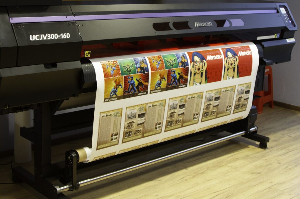 Wydruki wielkoformatowe wykonujemy na wszechstronnym urządzeniu MIMAKI UV UCJV300-160, które łączy funkcję drukowania oraz cięcia wykorzystując atrament utwardzany promieniami UV. Ploter drukująco-tnący to coś więcej niż możliwość druku i cięcia: przekracza granicę i daje możliwości uniwersalnego i wszechstronnego zastosowania. Drukarka Mimaki jest wyposażona w biały atrament do drukowania czterowarstwowego. Tworzy olśniewające panele podświetlane, które “zmieniają” schematy kolorystyczne w zależności od źródła światła. Drukuje i tnie etykiety, naklejki, grafiki samochodowe, szablony opakowań itp.