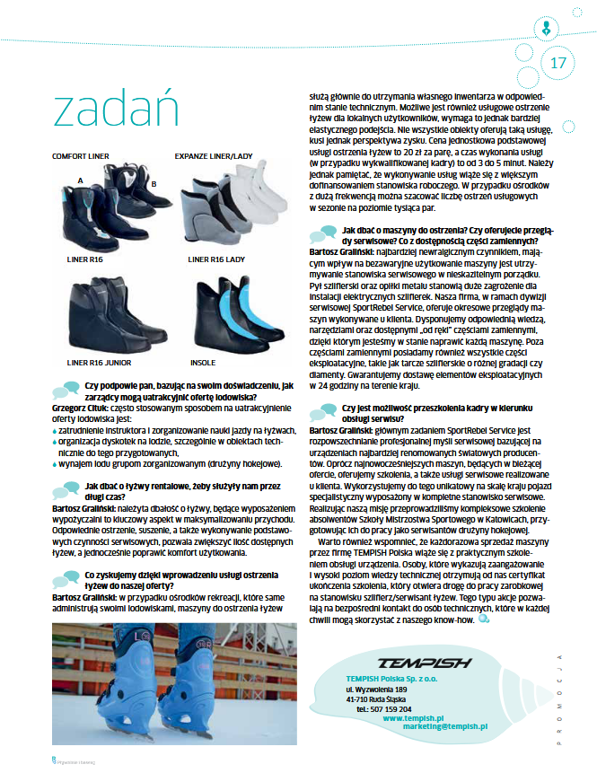 Bartosz Graliński: głównym zadaniem SportRebel Service jest rozpowszechnianie profesjonalnej myśli serwisowej bazującej na urządzeniach najbardziej renomowanych światowych producentów. Oprócz najnowocześniejszych maszyn, będących w bieżącej ofercie, oferujemy szkolenia, a także usługi serwisowe realizowane u klienta. Wykorzystujemy do tego unikatowy na skalę kraju pojazd specjalistyczny wyposażony w kompletne stanowisko serwisowe. Realizując naszą misję przeprowadziliśmy kompleksowe szkolenie absolwentów Szkoły Mistrzostwa Sportowego w Katowicach, przygotowując ich do pracy jako serwisantów drużyny hokejowej.