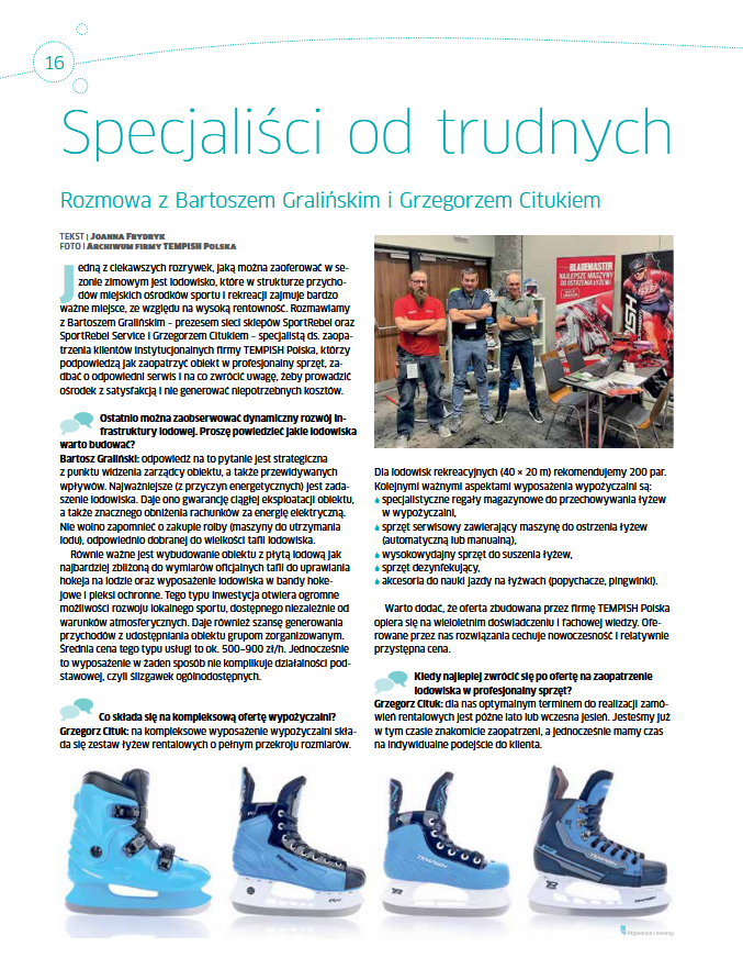 Oddajemy w Wasze ręce niezwykle ciekawy wywiad, który ukazał się w 28 wydaniu magazynu branżowego „Boiska i Stadiony”. W rozmowie udział wzięli – Bartosz Graliński – Prezes Sieci Sklepów SPORTREBEL – Grzegorz Cituk, pełniący funkcję Specjalisty ds. zaopatrzenia klientów instytucjonalnych firmy TEMPISH Polska. Podpowiadają oni jak zaopatrzyć obiekt w profesjonalny sprzęt, zadbać o odpowiedni serwis i na co zwrócić uwagę, żeby prowadzić ośrodek rekreacyjny z satysfakcją i nie generować niepotrzebnych kosztów. Zapraszamy do lektury!