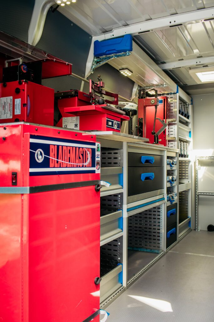 - sprzęt serwisowy zawierający maszynę do ostrzenia łyżew (automatyczną lub manualną),